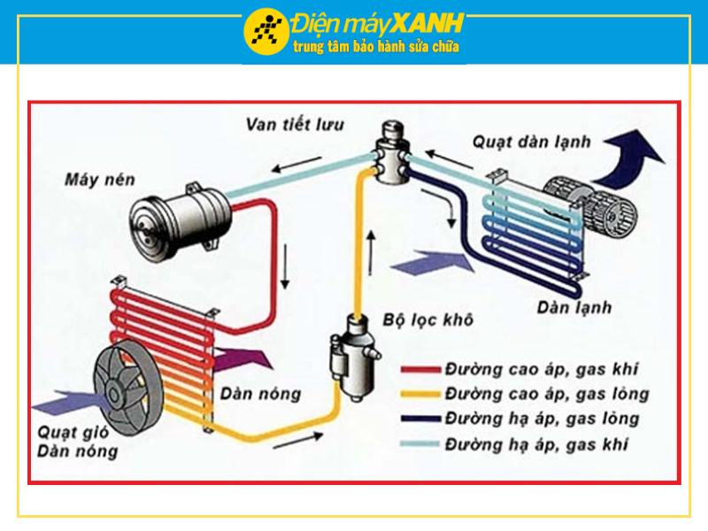 - Bước 5: Gas sau khi được làm mát tiếp tục quay lại van tiết lưu để giảm áp suất, giảm nhiệt, rồi bắt đầu một chu trình tuần hoàn mới.